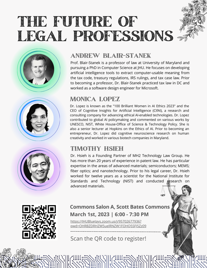 Join us for the Future of Legal Professions panel on March 1st, from 6-7:30pm in Scott-Bates Commons Salon A!