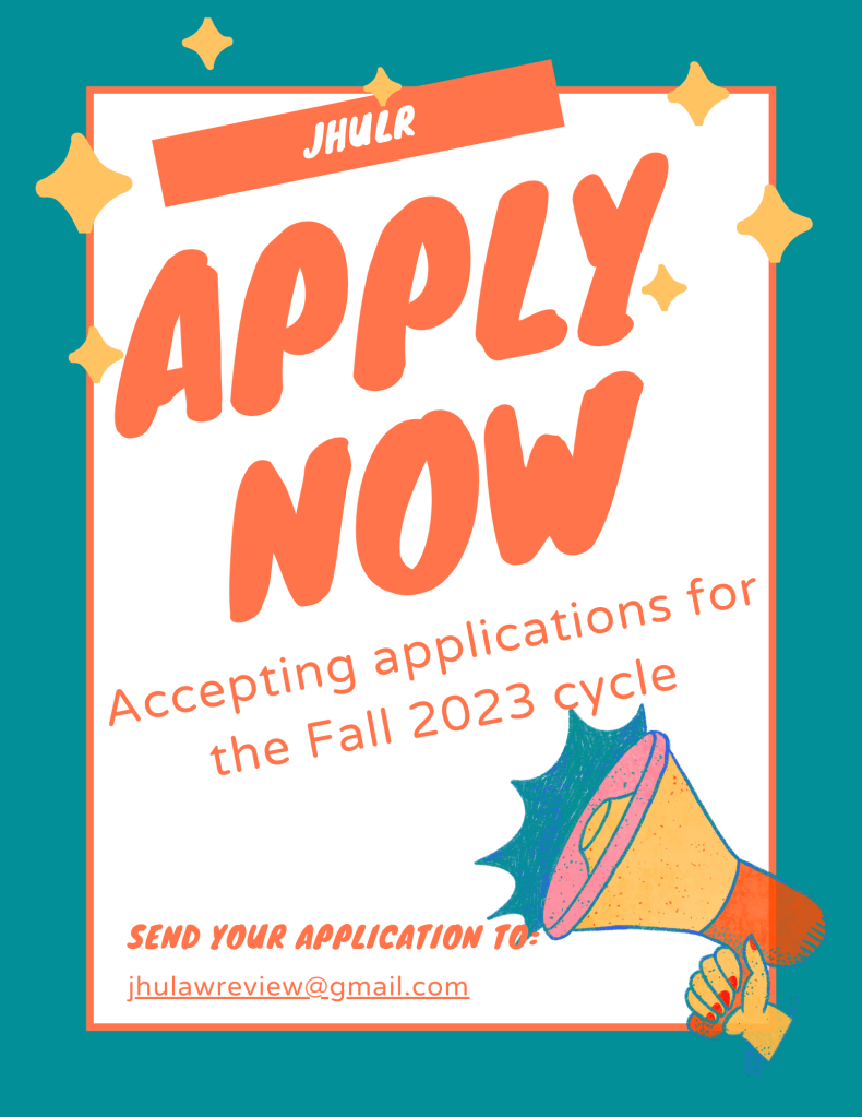 SPRING 2023 STAFF APPLICATIONS: The Johns Hopkins Undergraduate Law Review is excited to open applications for the Spring semester. Please download the application below and fill out by 11:59PM on Sunday, March 5, 2023 to be considered. Email application materials to jhulawreview@gmail.com