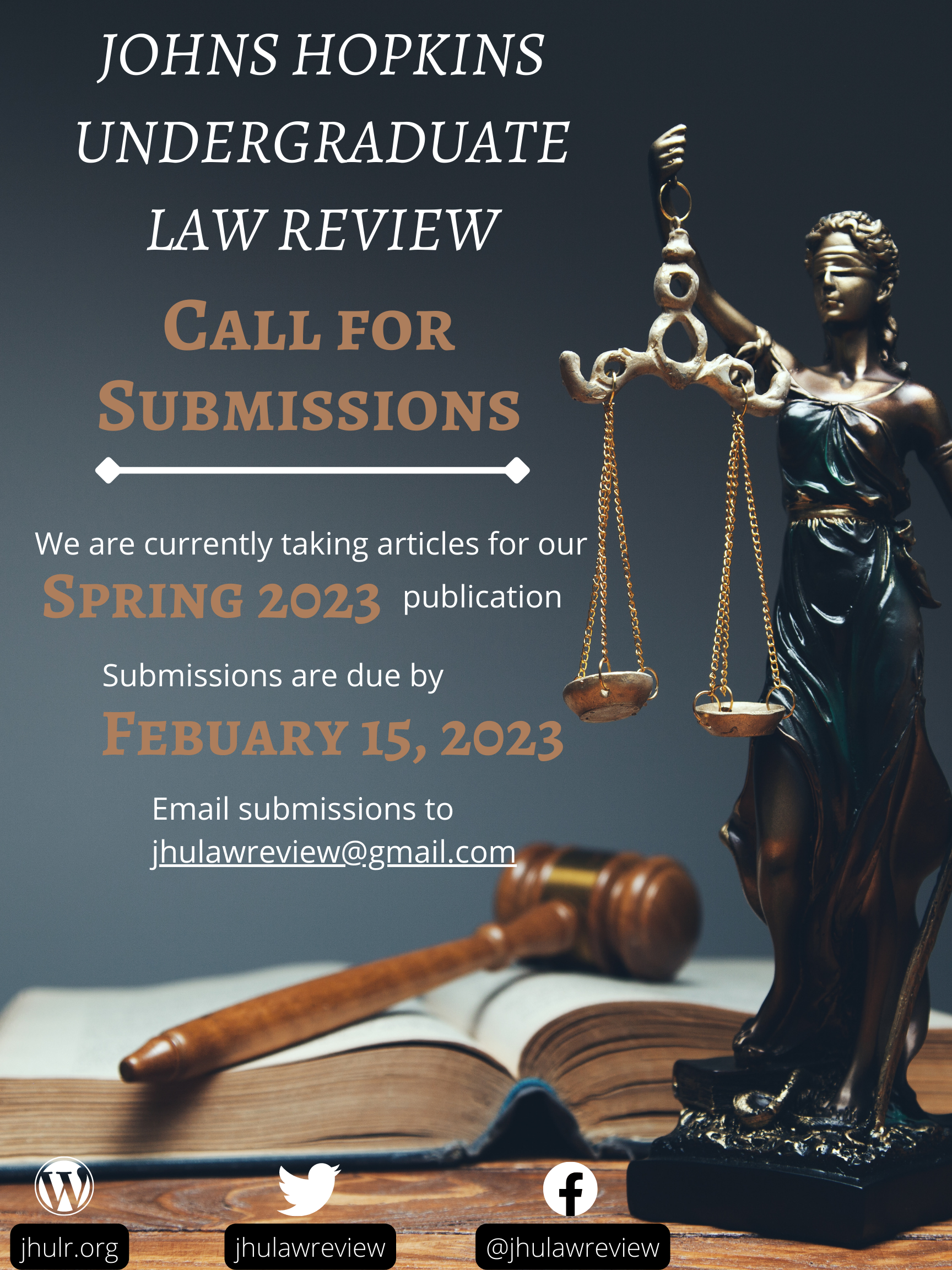 SPRING 2023 SUBMISSIONS CALL: The Johns Hopkins Undergraduate Law Review is excited to open our submissions call for the Spring 2023 journal. We’ll be accepting submissions at jhulawreview@gmail.com until February 15, 2023. Please visit https://jhulr.org/submit/ for submission guidelines.
